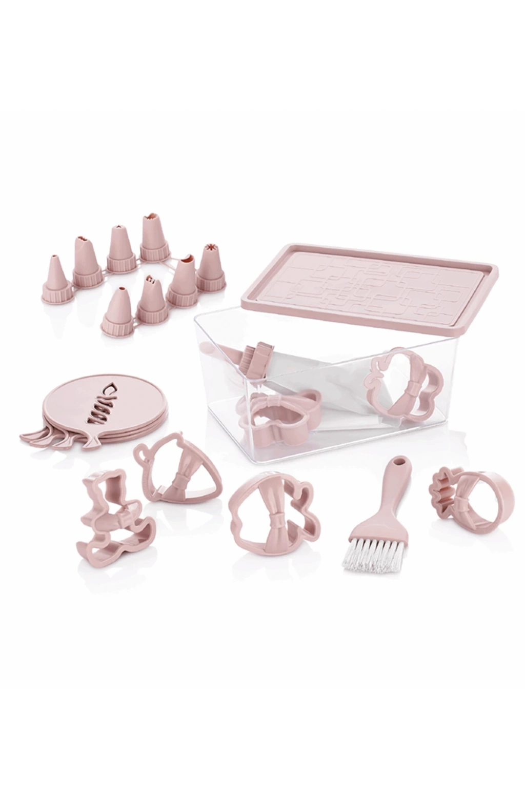 kutu İçeriği : Krema Torbası Şekilli Kapaklar Kurabiye Kalıpları Süsleme Şablonları Yumurta Fırçası Saklama Kabı