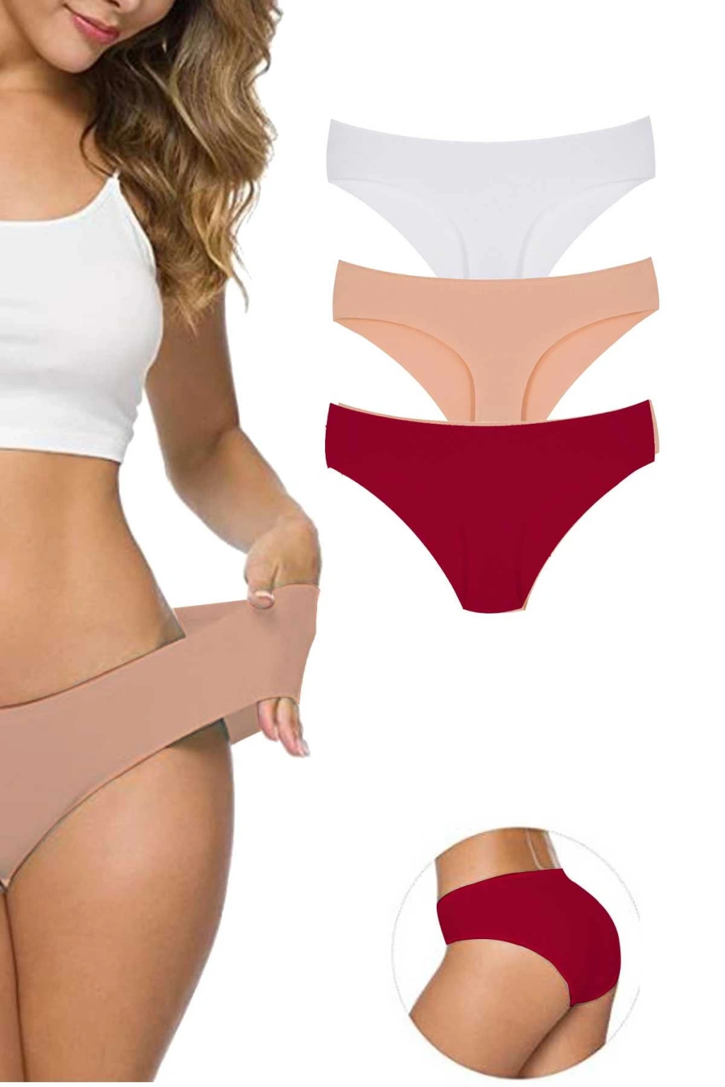3 Adet Kadın Dikişsiz Lazer Kesim Esnek İz yapmayan Külot Beyaz Ten Bordo