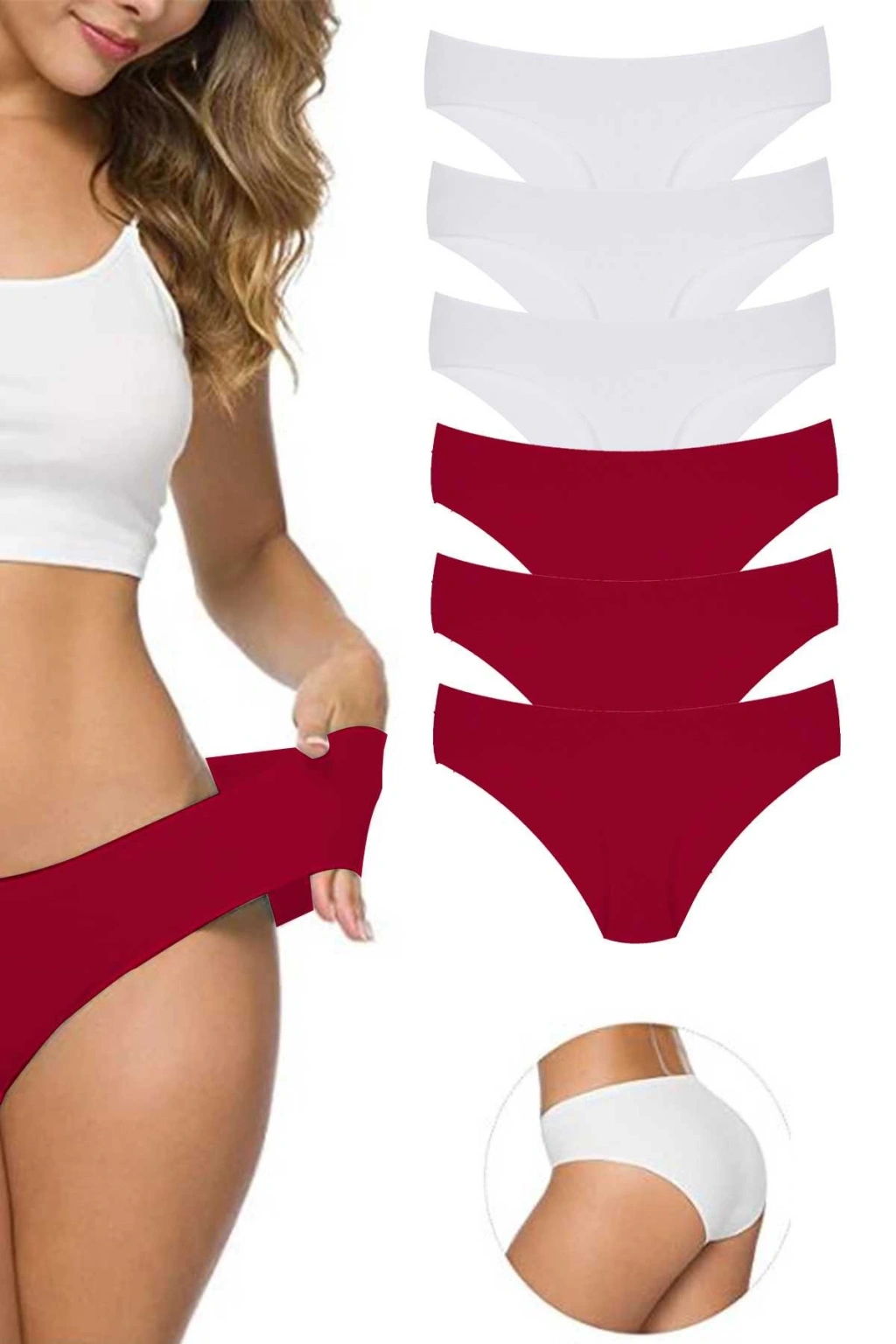 6 Adet Kadın Dikişsiz Lazer Kesim Esnek İz yapmayan Külot Beyaz Bordo