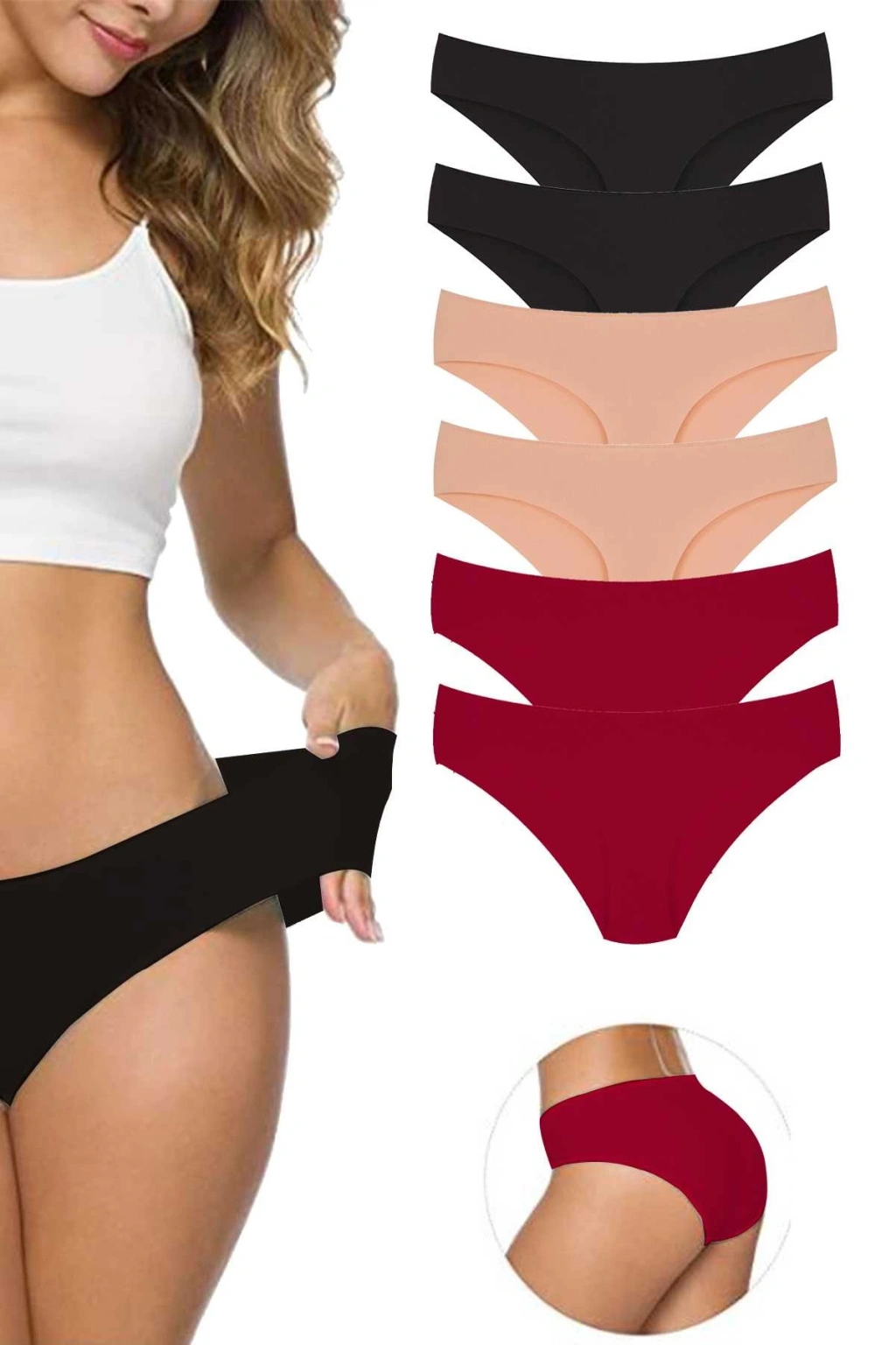 6 Adet Kadın Dikişsiz Lazer Kesim Esnek İz yapmayan Külot Siyah Ten Bordo