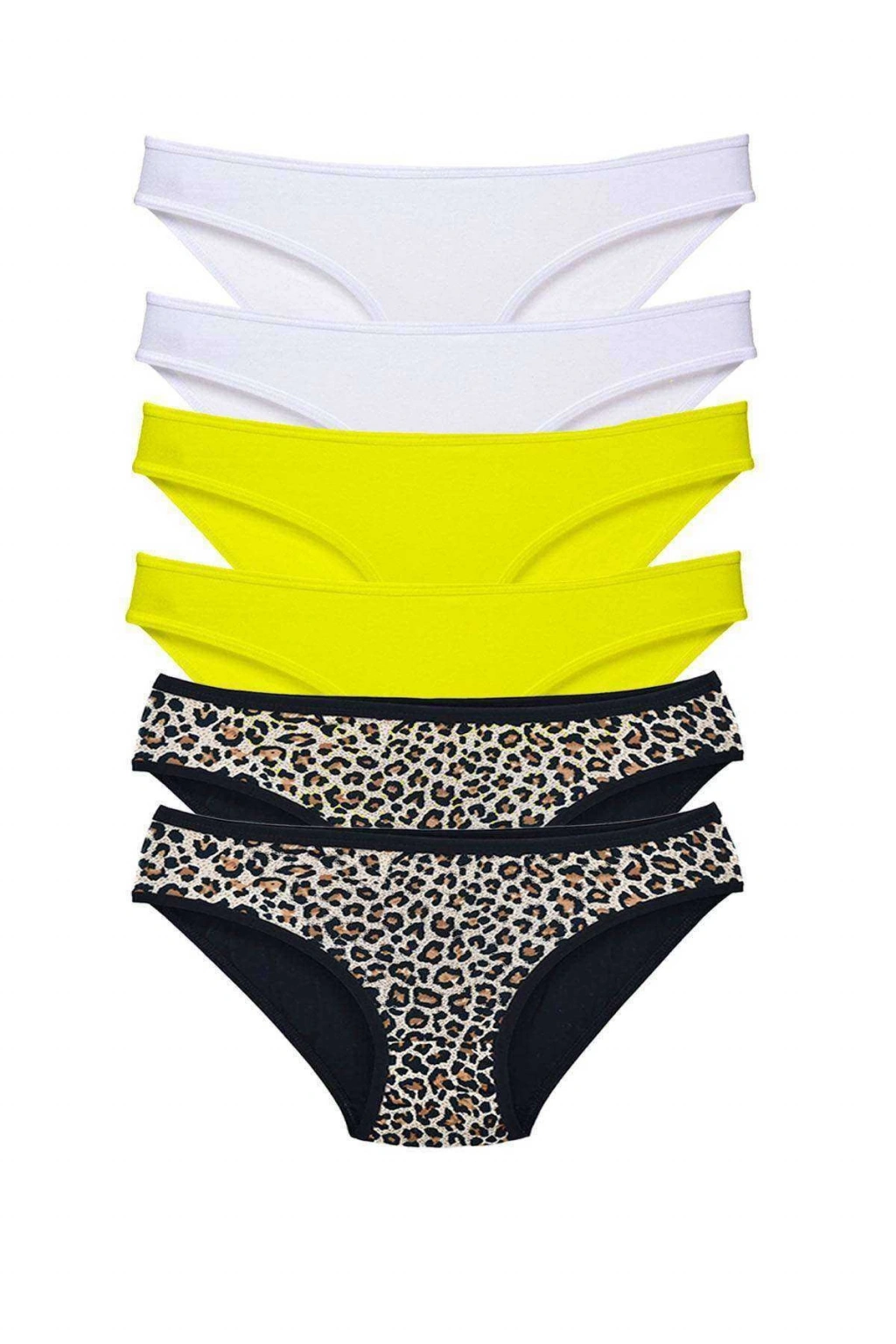 6 Adet Likralı Kadın Slip Külot Leopar Beyaz Sarı