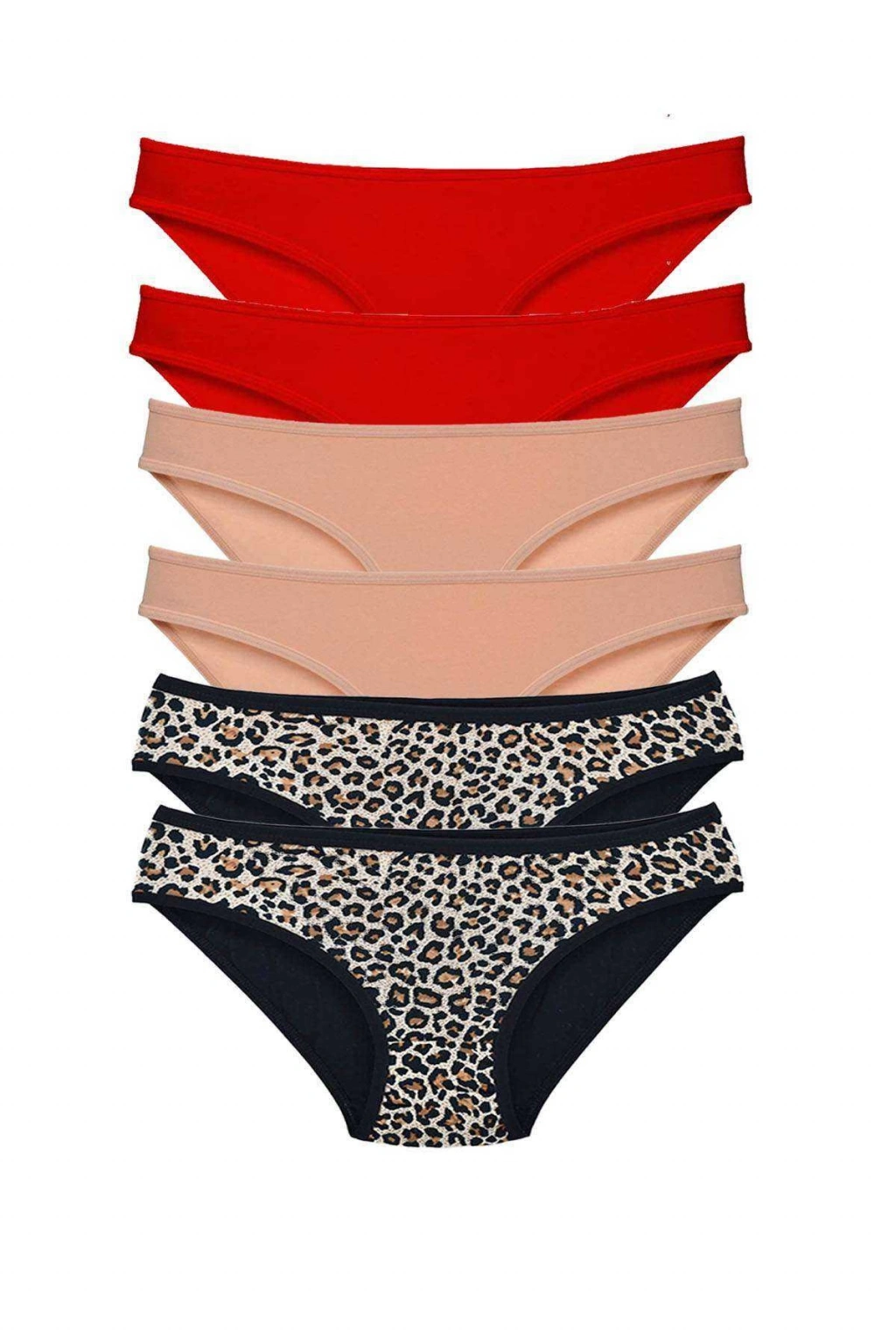 6 Adet Likralı Kadın Slip Külot Leopar Kırmızı Ten
