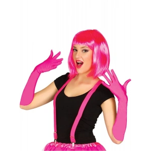 Fuşya Renk Saten Uzun Eldiven Ve Küt Parti Peruğu