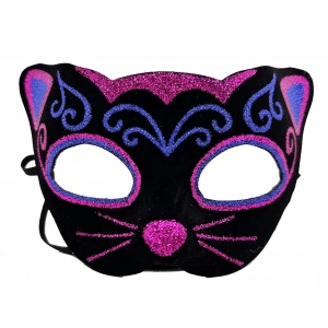 Siyah Kadife Kaplama Üzeri Pembe Yeşil Sim İşlemeli Kedi Maskesi 20x13 Cm