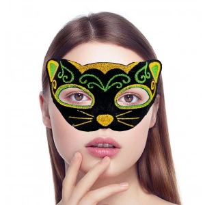 Siyah Kadife Kaplama Üzeri Sarı Yeşil Sim İşlemeli Kedi Maskesi 20x13 Cm