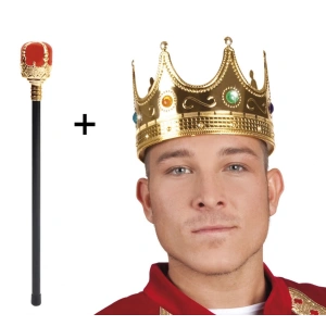 Altın Renk 60 Cm Kral Tacı Kraliyet Tacı Ve Kırmızı Topuzlu Kral Asası Seti