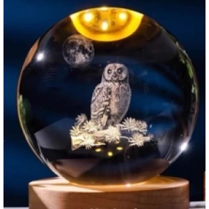 Dekoratif Baykuş Tasarımlı Ahşap Altlıklı Işıklı Cam Küre Büyük Boy 8cm
